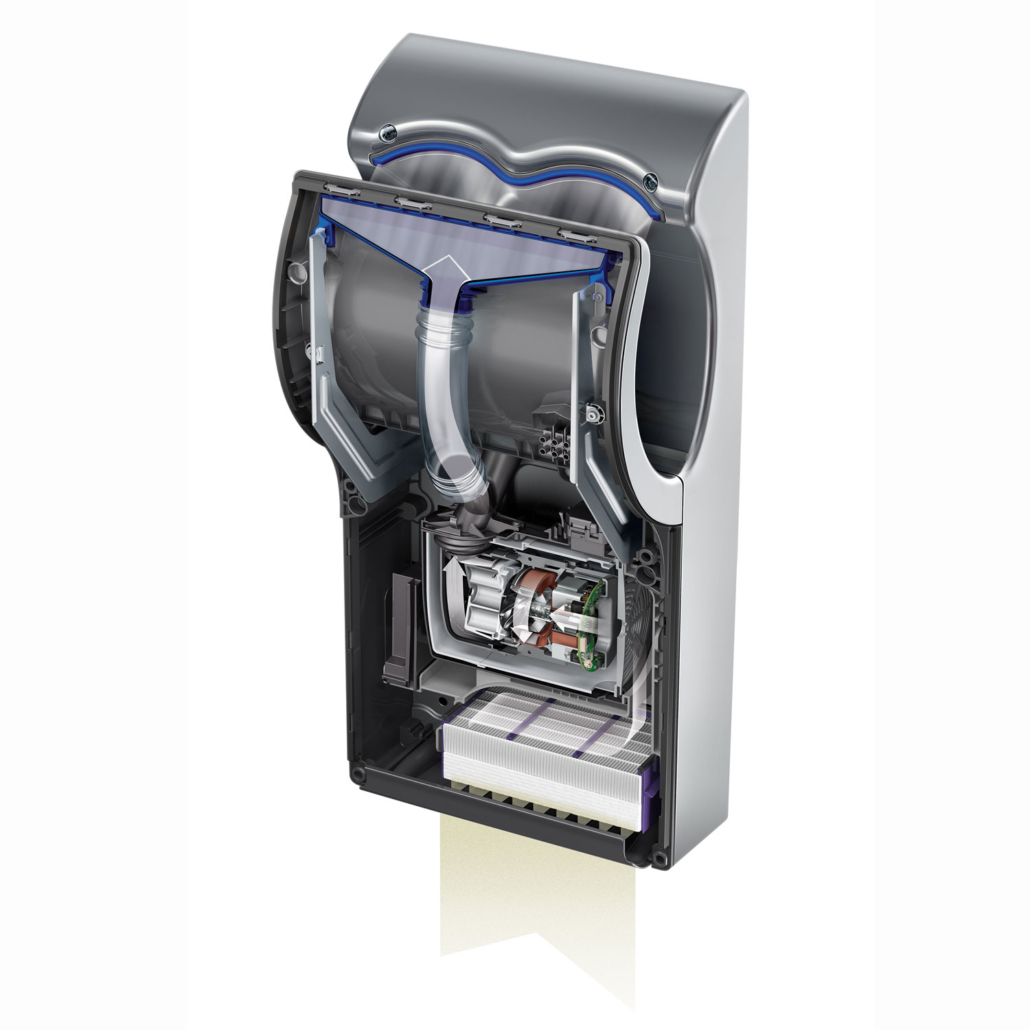 Den originale håndtørrer Dyson Airblade dB blæser 30 liter ren luft ud i sekundet takket være HEPA-filteret. Det sker gennem åbninger, der måler 0,8 mm i bredden. Dette skaber luftstrømme med en hastighed på 690 km/t, hvilket tørrer hænderne hurtigt og hygiejnisk. Luftstrømmene hjælper med at tørre vandet på hænderne, både på håndryggen og håndfladen, så de tørrer på blot 10 sekunder. Håndtørreren Dyson Airblade™ producerer op til 80% mindre CO2 end nogle anden håndtørrer og op til 81% mindre end papirhåndklæder. Dyson Airblade dB har opnået den internationale mærkning HACCP og må derfor anvendes i fødevaremiljøer.